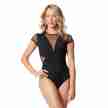 De achterzijde van dit Dames Balletpak heeft een mooie, ronde, middenhoge rughals die gesloten kan worden in de nek met een subtiel klipje. De voorzijde sluit hoog bij de hals, maar geeft ook een smaakvolle uitdagende look door de half transparante vlakken bij het decolleté en bij de taille. De kapmouwtjes van dit model blijven netjes op hun plek zitten door de elastische boordjes waarmee ze zijn afgewerkt.